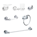 Kit completo de Accesorios Valencia. Incluye toallero barra, toallero argolla, portarrollos, jabonera, cepillera y percha. Plástico cromado. Con garantía Grival de 30 años.